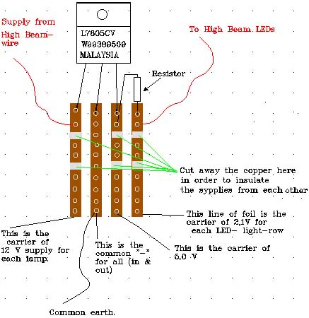 Then I used a piece of VERO-board with 4 x 14 holes and carefully soldered the voltage-regulators and resistors to it like the drawing (and photo) shows. I then drew the new wires to the old ones and soldered them together. Then I covered each soldered wire separately AND then the Vero-boards with heat-shrinking plastic tubing to insulate them.