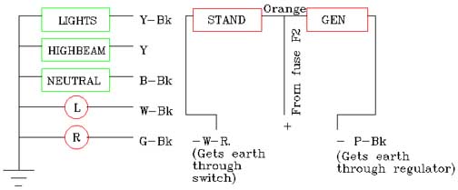 The wires from the "GEN"-lamp and "STAND"-lamp has a common "+" of the orange colour. The "-" is "PINK/BLACK" for the "GEN", and "BLUE/BLACK" for the "STAND".