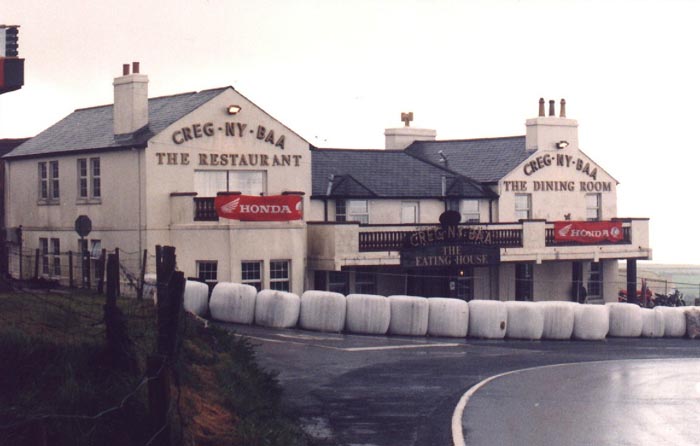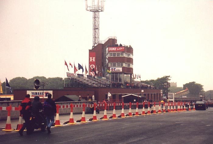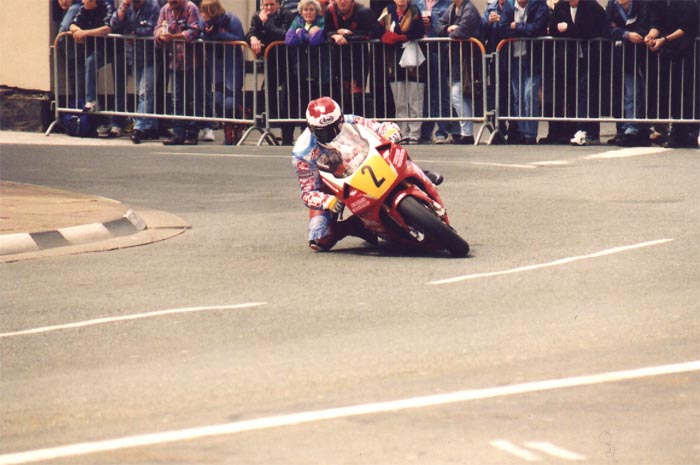 The day started out as if it would be nice but the rains started to move in. We did a little shopping to have a lunch to bring with us and again asked for a good viewing point. We were advised to go to the Braddan Bridge turns and sit in the churchyard. There were three and two pound seats so we opted for the more expensive ones. The view was great and the church had installed wooden benches for the spectators. The LightWeight race started and so did the rain. Many of my pictures from that day show the tops of lots of umbrellas and not too many motorcycles. It was a good viewing point but the race was shortened to two laps and we did not get too many good pictures as the low light and poor choice of 100 ASA film did not work. We did plan on coming here again tomorrow as it was an excellent viewing place.