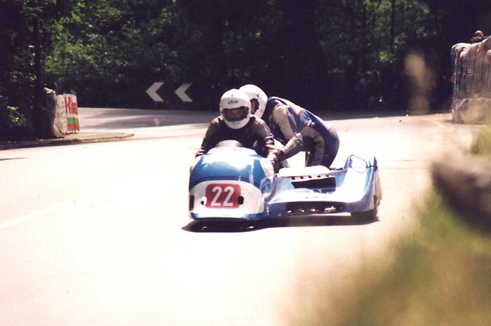 A quick visit to the Manx Museum but as the sun came out and the race time neared we left for Braddan Bridge and our churchyard. We tried a new approach and went in through the cemetery and were deep into the apex of the second turn, a right hander. With good sunlight we started to take pictures of the sidecars and one of the first ones through hit the curb and threw out the "monkey". He must have hit his head as he was a little confused and started to wonder around on the track. One of the Marshals called him over and he got out of harmÕs way. His driver was able to stop down the road and came running back. Not a happy reunion as the driver was very upset to have tossed out his passenger.