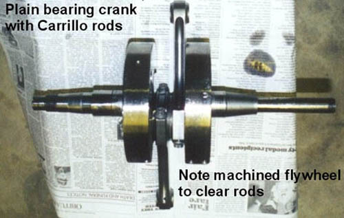 I have grouped these together because they sort of work hand-in-hand. Most of you already know from reading about Neilsen’s bike and probably some of your own experiences that the Achilles heel of the built-up bevel drive engine is the roller crankshaft. It will fail about every 4-6 hours in racing conditions. (My 750 GT with its nicely underpowered engine had the same crank for 110,000 miles, I even wore out the angular contact main bearings at 94,000-the phenolic cages disintegrated!). All of my racing cranks were put together by Jeff Bratton, who may be the best roller crank guy around. They were all balanced by Hank-the-Crank in North Hollywood. A 53-55% balance factor was used. My racing cranks would fail just like everyone else’s. I tried different kinds of oil, settling on Redline 20w-50, which played havoc with the clutch because it was so slippery. But that didn’t really help the crankshaft. Jeff Bratton would always call me upon receipt of the latest trashed crank and new rod set and say, "Kevin, these bearings on the old rod set are purple. This thing isn’t getting any oil." For reasons that are not clear to me (stupidity?) I didn’t go to Axtell with the problem until much later. In the meantime I tried first a simple roller crank conversion that I obtained from Albert Bajohr in Germany, who I met at Daytona in ’83. That stopped the crank failures, but later I went on to a complete changeover to Carillo rods and my own pin. More on that later.