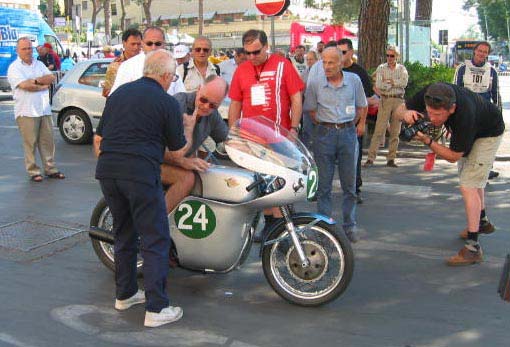 Heres bike journo Alan Cathcart, on the Hailwood 250, mechanic is signalling that its only running on 1. They did