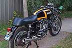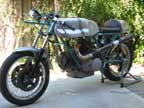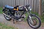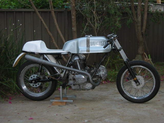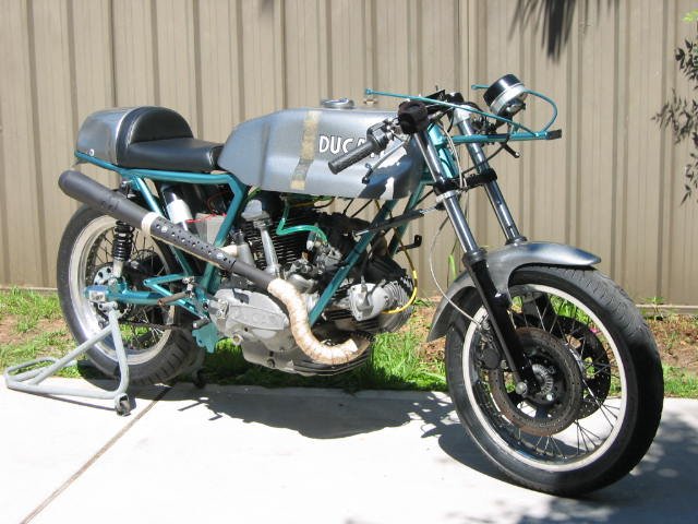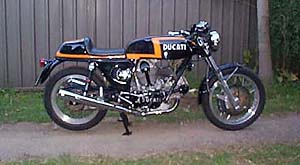 Specs: GT frame, 38mm Marzocci forks, Koni shocks, 73 Imola fairing, 950cc engine, 90mm Wiseco pistons, Vee Two crank polished and lightened, 900 barrels, twin plugged desmo heads, Imola cams, Dyna ignition, Vee Two straight cut primary gears, Imola high pipes, 40mm Dellorto's, Borrani rear rim WM5, stainless spokes, 220 mm brembo disc, 08 Brembo caliper, DID front rim, stainless spokes, drilled 280mm 4 bolt brembo disc's, 08 Brembo calipers, 81 SS forks have Progressive suspension springs and 5wt oil.