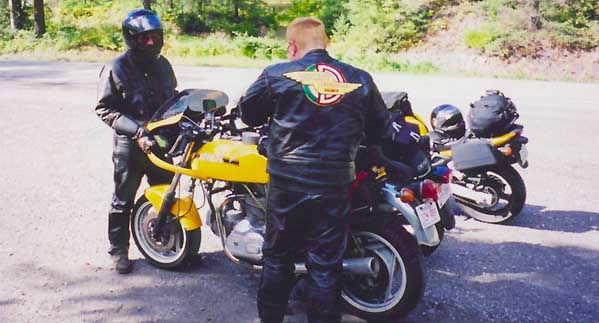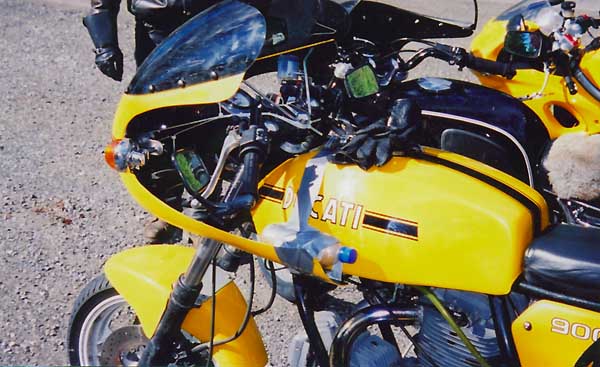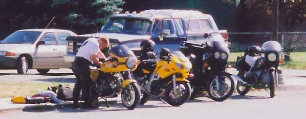 ...fixing fuses across the street (for the fourth time that day) however, can be missed... left to right... my dead duc... Rocket Boy's SV 650... Mr.GPS-and-every-other-gadget-known-to-man's Triumph Tiger... and the Beemer Geek's Panzer