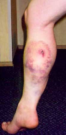 No... too much timing advance resulting in a nasty kickback... just one... through my leathers just above my boot... photo taken shortly after... it got worse... and boy did it hurt!... made hard and nervous work of starting the bike for the rest of the week too, not to mention making my boot a bit tight!... and you 450 singles guys think you have it bad!